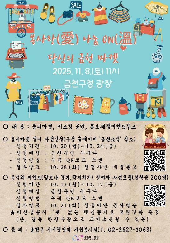 [뉴스앤톡] 금천구는 오는 11월 8일 금천구청 광장 앞에서 ‘봉사랑(愛) 나눔ON(溫), 당신의 금천마켓’을 연다고 밝혔다.