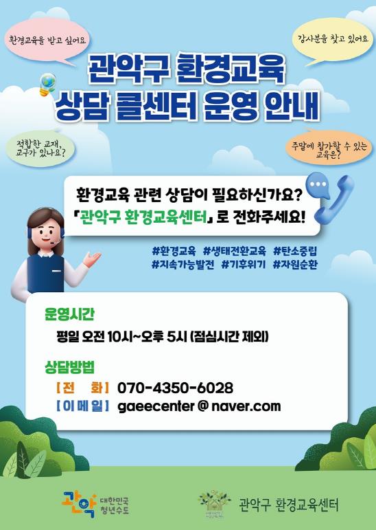 한편, 구는 주민과 기관‧기업의 환경교육 참여를 지원하기 위해 ‘관악구 환경교육 상담 콜센터’를 시범 운영하고 있다.