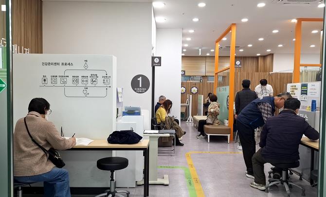 ▲ 구로구보건소 건강관리센터를 방문한 주민들이 대사증후군 검진과 건강상담을 위해 대기하거나 설문지를 작성하고 있다.