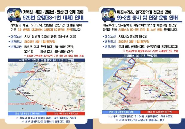 아울러 2월 1일에는 배곧과 정왕동 일원의 접근성 강화를 위해 시내버스 일반형 99-2번 노선도 증차ㆍ연장 운행된다. 99-2번은 차량 1대를 늘리고, 기존 이마트에서 한국공학대와 정왕동 차고지까지 운행 구간을 확대해 배곧 누리초등학교 일원 주거지역과 대학, 산업단지 간 이동 여건 개선에 이바지할 것으로 보인다. 시는 운송개시에 앞서 시민 혼선을 최소화하기 위해 사전 홍보를 진행하고, 이후에도 실제 이용 여건과 운행 상황을 면밀하게 살필 계획이다.