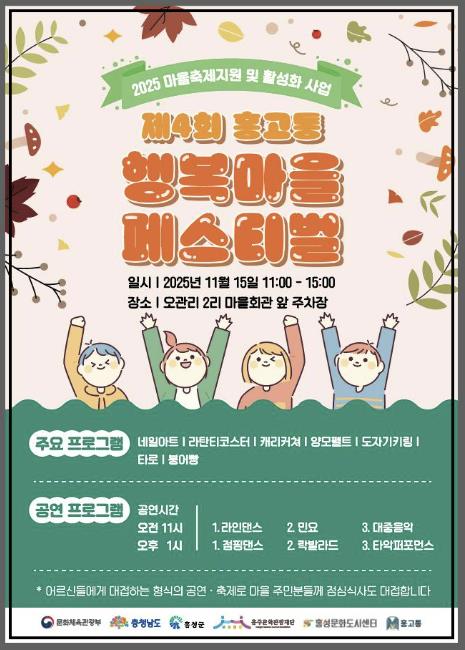 [뉴스앤톡] 홍성군은 15일 오관2리 마을회관 주차장 일원(홍성읍 조양로143번길 35-12)에서 ‘제4회 홍고통 행복마을 페스티벌’을 개최한다고 밝혔다.