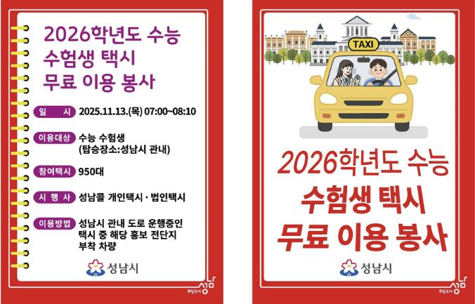 개인택시와 법인택시 총 950여 대가 오전 7시부터 8시까지 ‘2026학년도 수능 수험생 택시 무료 이용 봉사’ 표지를 부착하고, 수험생을 대상으로 시험장까지 무료 운행 서비스를 제공한다. 수험생은 성남콜택시(031-755-4000)를 통해 택시를 호출하면 시험장까지 무료로 이동할 수 있다.