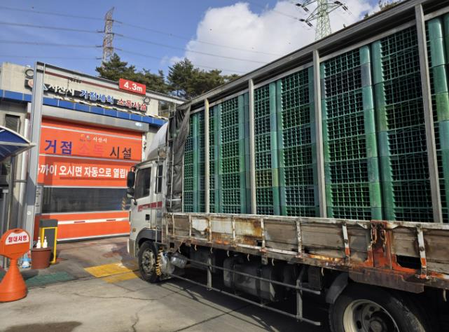 | ▲ 축산차량이 소독을 위해 음암면에 있는 거점소독시설에서 대기하는 모습 |