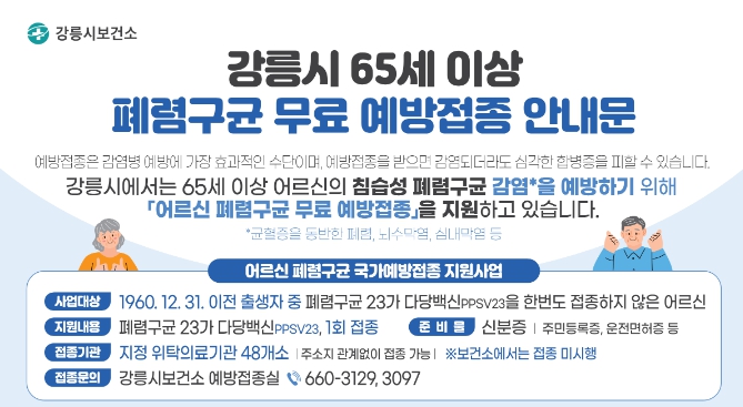 [뉴스앤톡] 강릉시는 기온이 급격히 떨어지는 겨울철을 앞두고 면역력이 저하된 65세 이상 어르신들의 폐렴구균 예방접종률이 저조함에 따라, 중증 감염병 예방을 위한 시민들의 적극적인 접종 참여를 당부했다.