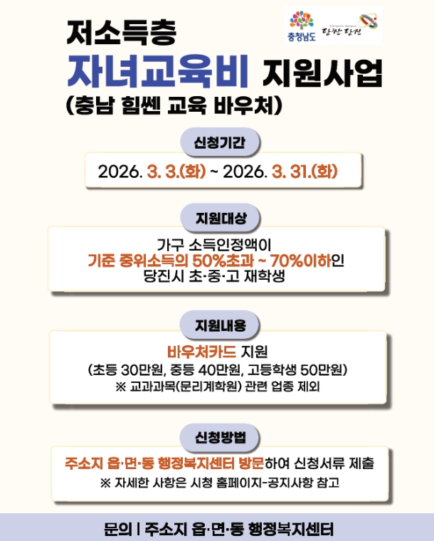 [뉴스앤톡] 당진시가 오는 3월 3일부터 당진시에 주민등록을 둔(학생 또는 보호자) 초중고 자녀를 대상으로 저소득층 자녀교육비 지원(충남 힘쎈교육바우처)사업을 추진한다고 26일 밝혔다.