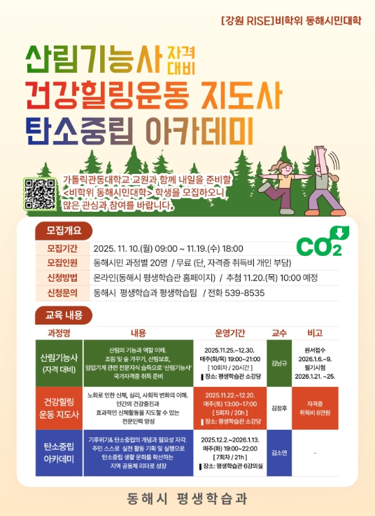 [뉴스앤톡] 동해시는 시민의 평생학습 역량 강화를 위해 '비학위 동해시민대학' 전문과정으로 ▲산림기능사(자격대비) ▲건강힐링운동 지도사 ▲탄소중립 아카데미 3개 과정을 개설하고, 오는 11월 19일까지 동해시 평생학습관 홈페이지를 통해 수강생을 모집한다.
