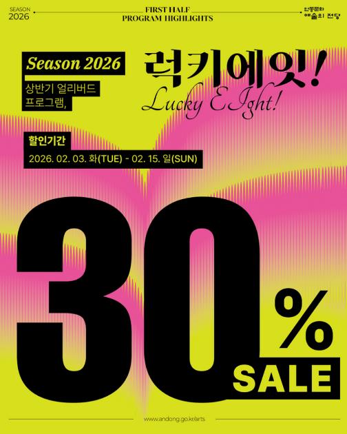 [뉴스앤톡] 안동문화예술의전당은 상반기 주요 공연을 대상으로 30% 할인 혜택을 제공하는 특별 프로모션 ‘럭키에잇!’을 진행한다고 밝혔다.