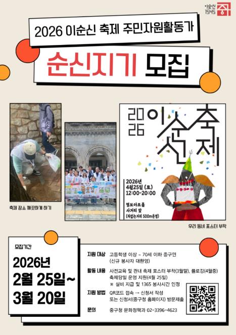 이번에 모집하는 ‘순신지기’는 단순한 봉사를 넘어 축제의 기획과 운영 과정에 주민이 주도적으로 참여하는 자원활동 프로그램이다. 모집 인원은 총 60명으로, 만 16세 이상 70세 이하 중구민과 관내 고등학생·대학생이면 누구나 지원할 수 있다. 축제 자원봉사 신규 참여자를 우선 선발한다.