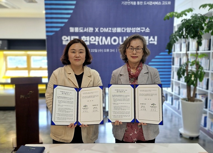 [뉴스앤톡] 파주시 월롱도서관은 지난 22일 디엠지(DMZ)생물다양성연구소와 지역사회 독서진흥 및 생태환경 분야 협력을 위한 업무협약을 체결했다.