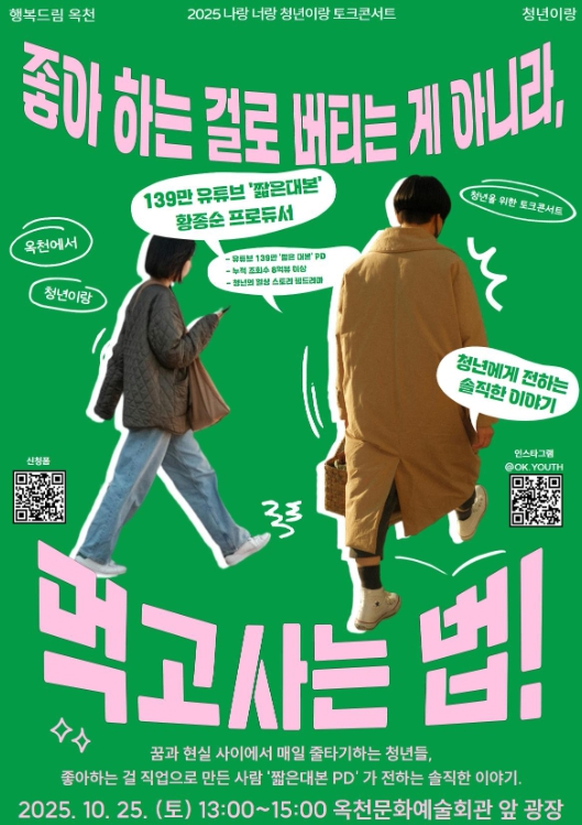 [뉴스앤톡] 옥천군은 오는 10월 25일 오후 1시, 문화예술회관 앞 광장에서 청년의 관심사와 목소리를 반영한 '2025년 청년 토크콘서트' 1회차 ‘청년이 청년에게’를 개최한다.