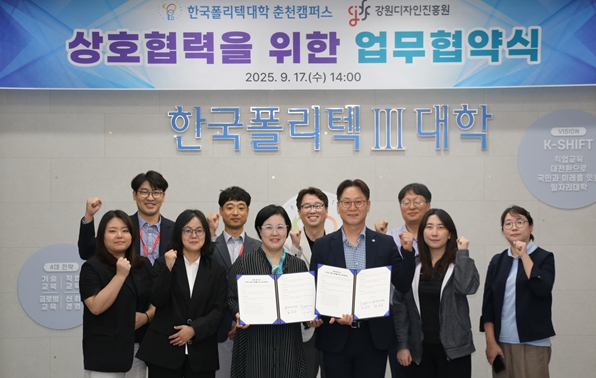 [뉴스앤톡] 강원디자인진흥원은 9월 17일 한국폴리텍Ⅲ대학 춘천캠퍼스(학장 지경배, ‘한국폴리텍Ⅲ대학’)과 디자인산업 발전과 지역 인재 양성 상호협력을 위한 업무협약을 체결했다.