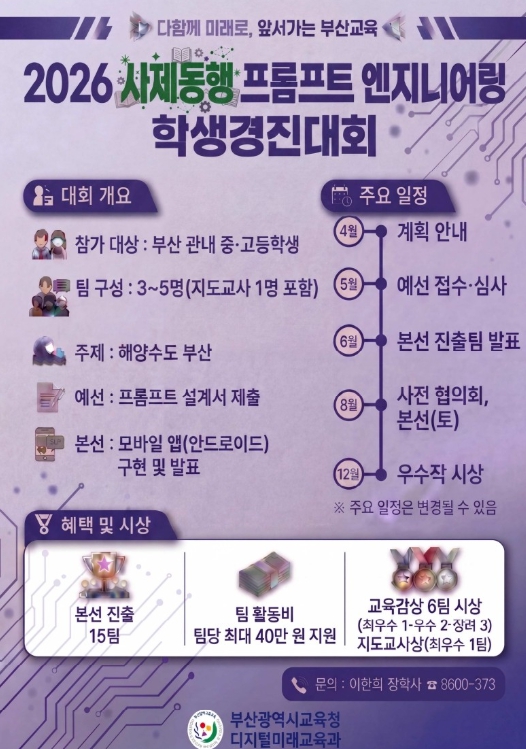 [뉴스앤톡] 부산광역시교육청은 관내 중·고등학생과 교사가 한 팀으로 참여하는 ‘사제동행 2026 프롬프트 엔지니어링 학생경진대회’를 개최한다고 밝혔다.