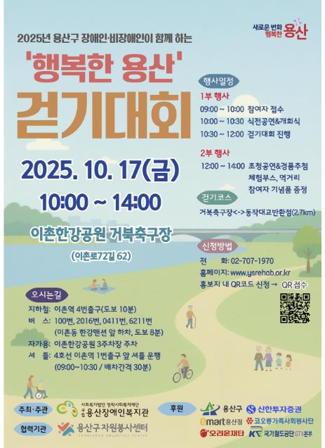 [뉴스앤톡] 서울 용산구가 오는 17일 오전 10시 이촌한강공원 거북축구장 및 산책로 일대에서, 구립용산장애인복지관 주최로 열리는 ‘2025 장애인과 비장애인이 함께 하는 행복한 용산 걷기대회’를 후원한다.