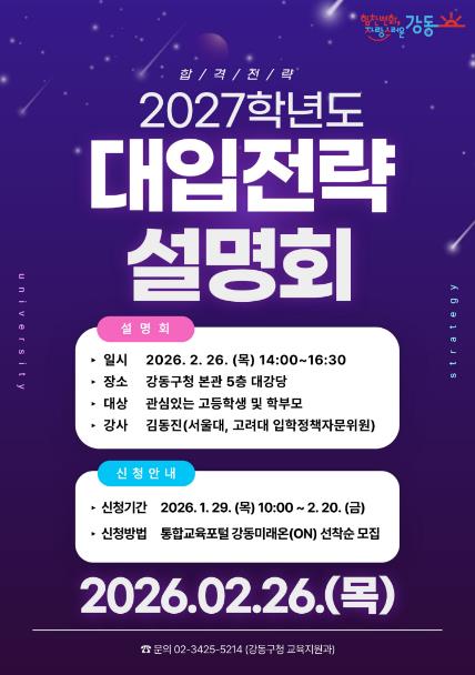 [뉴스앤톡] 서울 강동구가 2027학년도 대학입학전형에 대비한 올해 첫 대입전략설명회를 오는 2월 26일 강동구청 5층 대강당에서 개최한다고 28일 밝혔다.