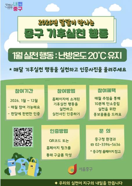 구 관계자는 “1월 미션을 시작으로 매달 이어지는 기후실천 행동이 주민들의일상 습관으로 자리잡길 바란다”며 “작은 실천이 모여 큰 변화를 만드는 만큼, 앞으로도 주민과 함께하는 생활 속 탄소중립 정책을 꾸준히 이어가겠다”고 말했다.