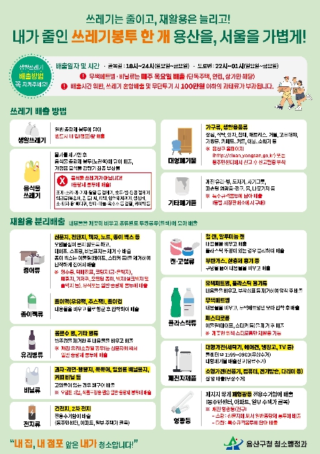 [뉴스앤톡] 서울 용산구가 주민 누구나 생활쓰레기 분리배출 정보를 쉽게 이해하고 실천할 수 있도록 주요 배출 정보를 한 장에 담은 안내문을 제작·배포한다.