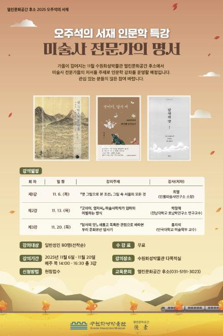 [뉴스앤톡] 수원화성박물관 열린문화공간 후소가 11월 6일부터 20일까지 매주 목요일 오후 2시 ‘오주석의 서재 인문학 특강–미술사 전문가의 명서’를 연다.