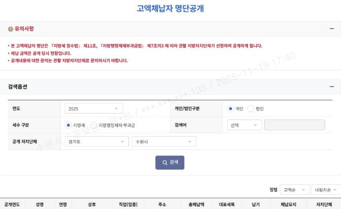 고액·상습체납자 명단은 수원시 홈페이지'분야별정보'세금'정보마당'‘고액 상습체납자 공개’ 게시판에서 확인할 수 있다.