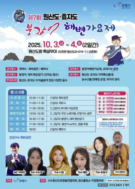 [뉴스앤톡] 보령시가 주최하고 (사)원산도관광발전협의회가 주관하는 ‘제7회 원산도·효자도 붕장어 해변가요제’가 오는 10월 3일부터 4일까지 2일간 원산도항 특설무대에서 개최된다.