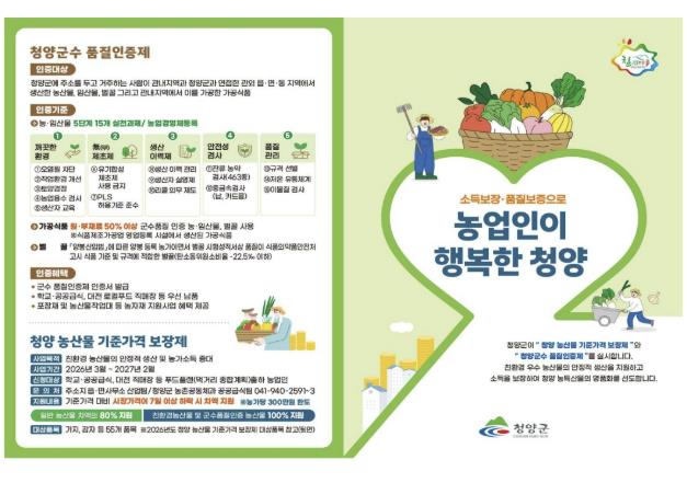 [뉴스앤톡] 청양군은 농산물 가격 하락으로 인한 농가의 경영 불안을 해소하고, 안정적인 소득 기반을 마련하기 위해 2026년 청양 농산물 기준가격 보장제 신청·접수를 시작했다.