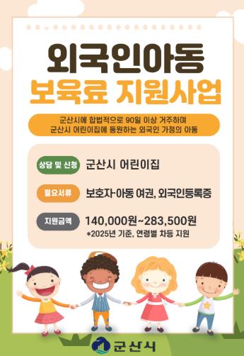 군산시 관계자는 “외국인 아동 보육료 지원사업을 통해 외국인 주민이 지역사회에 조기 정착할 수 있는 기반을 마련하고, 아이들이 보다 안정된 환경에서 성장하도록 돕는 계기가 될 것”이라고 밝혔다.