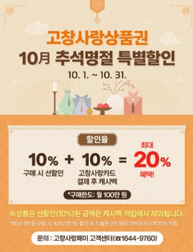 이번 특별할인은 △상품권 구매시 10% 선할인 △고창사랑카드 결제시 10% 캐시백 적립을 통해 최대 20% 혜택을 받을 수 있도록 구성됐다.