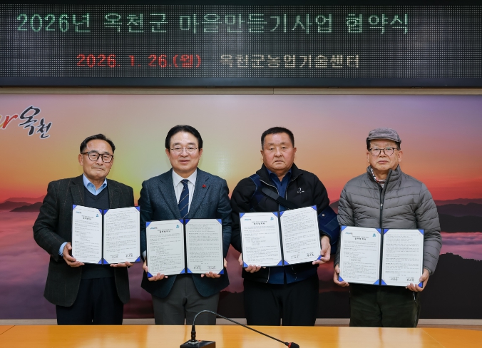 [뉴스앤톡] 옥천군은 1월 26일 오후 2시, 옥천군농업기술센터 2층 소회의실에서 ‘2026년 옥천군 마을만들기사업 협약식’을 열고 동이면 금암2리, 안남면 도덕1리, 청산면 한곡리 등 3개 마을과 협약을 체결했다.
