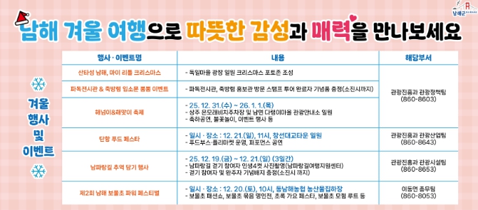 [뉴스앤톡] 남해군은 겨울 여행 관광객 유치와 체류형 관광 활성화를 위하여 다양한 매력적인 행사 ․ 이벤트를 개최한다.