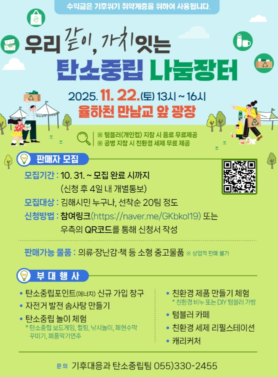 [뉴스앤톡] 김해시는 김해시기후환경네트워크와 함께 오는 22일 율하유적전시관 앞 광장 일원에서 ‘우리 같이, 가치 잇는 탄소중립 나눔장터’를 개최한다고 20일 밝혔다.