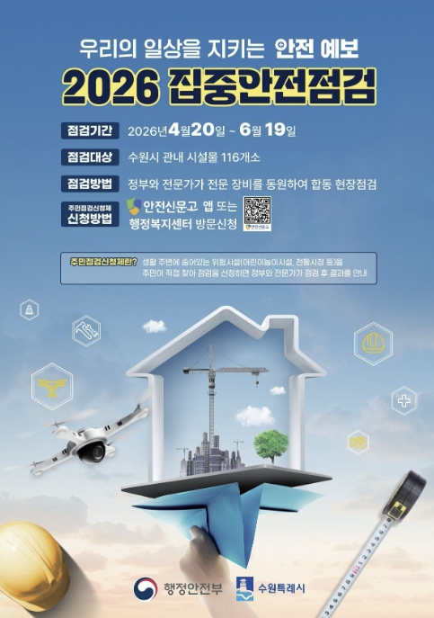 [뉴스앤톡] 수원특례시가 안전사고를 예방하고, 시민의 안전 의식을 고취하기 위해 20일부터 6월 19일까지 ‘2026년 집중안전점검’을 한다.