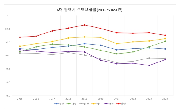 울산은 지난 2015년 이후 2024년까지 10년간 주택보급률이 100%를 넘었으며, 6대 광역시 중 가장 높은 수치를 기록했다.