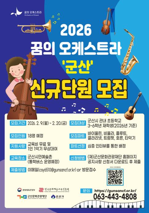[뉴스앤톡] (재)군산문화관광재단이 ‘2026 꿈의 오케스트라 군산’과 함께 할 신규단원을 오는 20일까지 공개 모집한다.