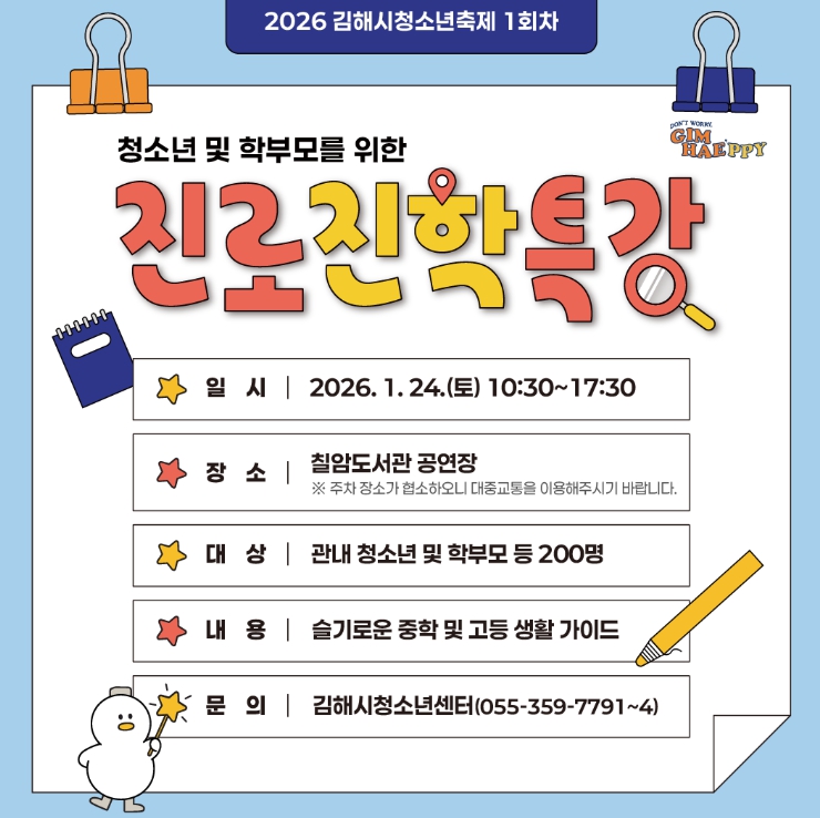 [뉴스앤톡] 김해시청소년센터는 오는 24일 칠암도서관 공연장에서 청소년과 학부모를 위한 ‘2026 청소년 진로·진학특강’을 개최한다고