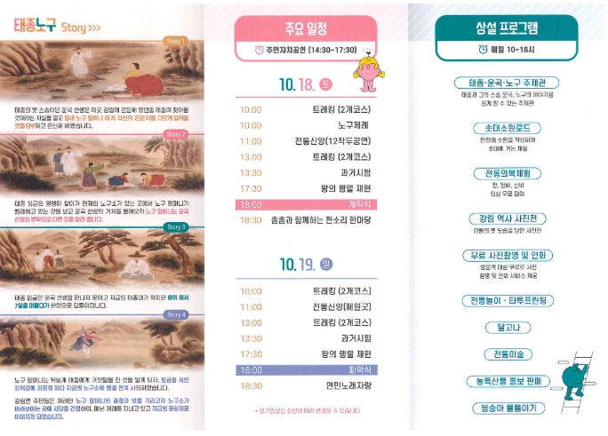 올해 문화제는 ‘태종과 노구, 역사의 숨결을 걷다’를 주제로, 강림의 천혜의 자연환경과 유서 깊은 역사문화를 함께 느낄 수 있는 다채로운 프로그램이 마련됐다.