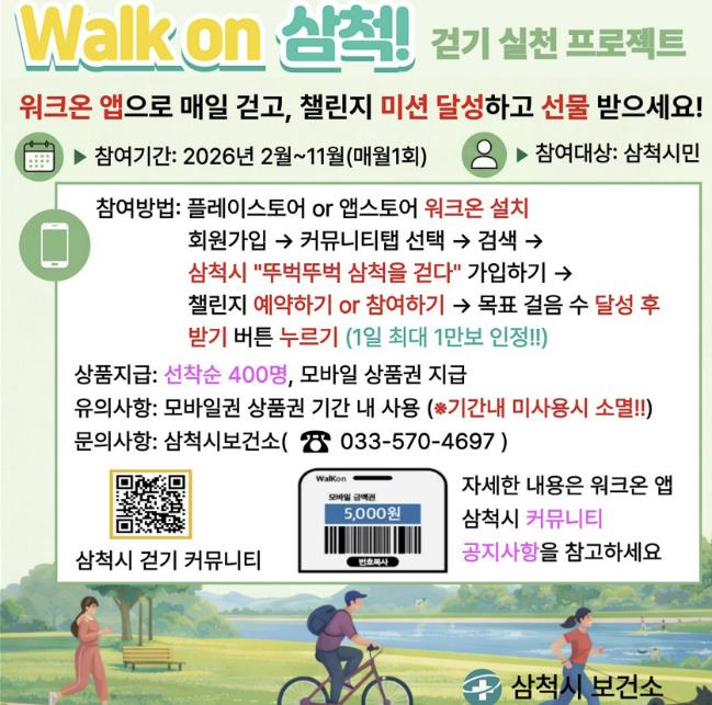 [뉴스앤톡] 삼척시는 시민들의 건강 증진과 일상 속 걷기 실천율 향상을 위해 모바일 걷기 앱 '워크온(Walk On)'을 활용한 ‘워크온 걷기 챌린지’를 오는 2월부터 11월까지 운영한다.