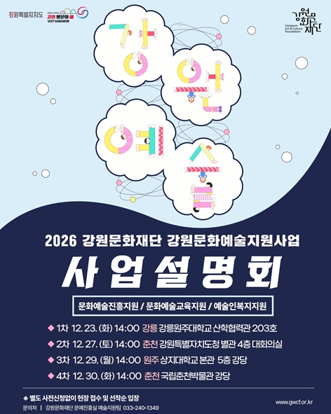 이번 사업설명회는 ▲ 12월 23일 14시, 강릉원주대학교 산학협력관 203호 ▲ 12월 27일 14시, 강원특별자치도청 별관 4층 대회의실 ▲ 12월 29일 14시, 상지대학교 본관 5층 강당 ▲ 12월 30일 14시, 국립춘천박물관 강당에서 진행된다.