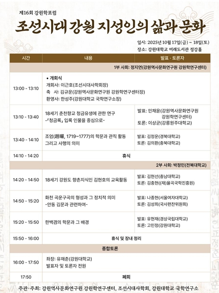 [뉴스앤톡] 강원역사문화연구원 강원학연구센터는 2025년 10월 17일 오후 1시, 강원대학교 미래도서관 정강홀에서 제16회 강원학포럼 ‘조선시대 강원 지성인의 삶과 문화’를 조선시대사학회·강원대학교 국학연구소와 공동으로 개최한다.