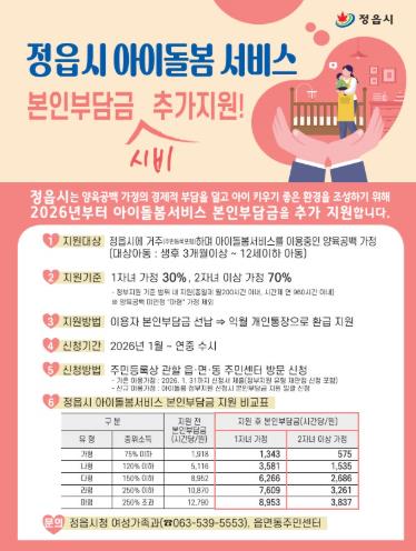 지원 대상은 정읍시에 주민등록을 두고 거주하는 가정 중 부모의 맞벌이 등으로 양육 공백이 발생한 경우이며, 대상 아동은 생후 3개월 이상부터 12세 이하까지다.