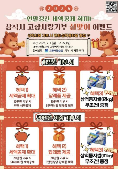 [뉴스앤톡] 삼척시는 2026년 고향사랑기부제 세액공제 혜택 확대를 기념해 설 명절을 맞아 '삼척시 고향사랑기부제 설맞이 이벤트'를 진행한다.