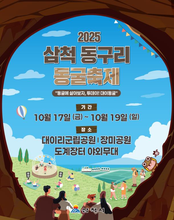 [뉴스앤톡] 삼척 동구리 동굴축제가 10월 17~19일 대이리군립공원(대이동굴)·삼척장미공원·도계장터 야외무대에서 동시에 열린다. ‘동굴에 살아보자, 투데이! 대이동굴’을 슬로건으로 한 올해 축제는 가족 공연과 실감형 동굴체험, 도심·생활권 무대를 셔틀망으로 연결하는 분산형 운영으로 하루 동선을 완성했다.