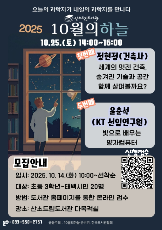 올해 산소드림도서관에서는 ▲건축사 정현정 강사의 '세계의 멋진 건축'과 ▲KT 선임연구원 윤춘석 강사의 '빛으로 배우는 양자컴퓨터' 등 2개 주제로 약 2시간 동안 강연이 진행될 예정이다.