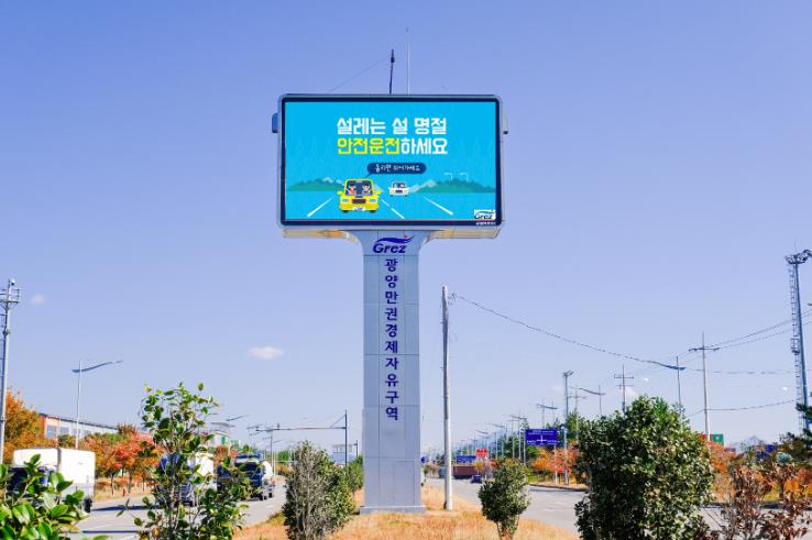 광양경자청은 2022년 11월부터 대형 전광판을 통해 지역 개발 소식과 공공정보를 주민에게 전달해 왔으며, 특히 명절이나 휴가철과 같이 방문객이 증가하는 시기에는 공익성과 실효성이 높은 안전 콘텐츠를 우선적으로 송출하고 있다.