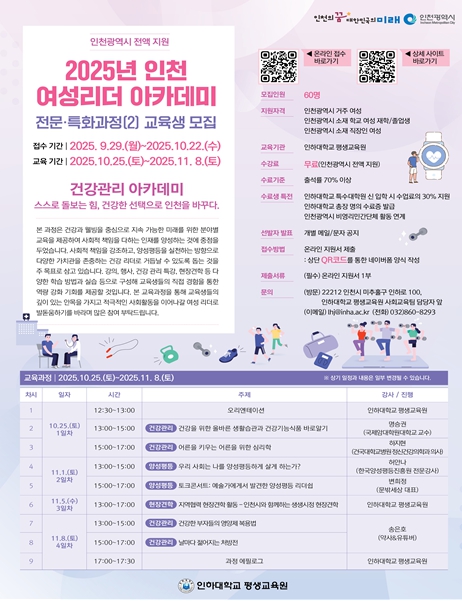 [뉴스앤톡] 인천광역시는 역량 있는 여성 인재를 발굴하고 육성하기 위해 인하대학교 평생교육원과 함께 ‘2025 인천 여성리더 아카데미’ 두 번째 전문・특화과정인 ‘건강관리 아카데미’ 교육생을 모집한다고 밝혔다.