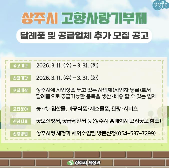 모집 대상은 상주시에 사업장을 두고 있는 사업체로, 지역에서 생산·가공된 ▲농·축·임산물, ▲가공식품·제조물품, ▲관광·서비스 등 고향사랑기부제 답례품으로 제공이 가능한 상품을 보유한 사업자이다.