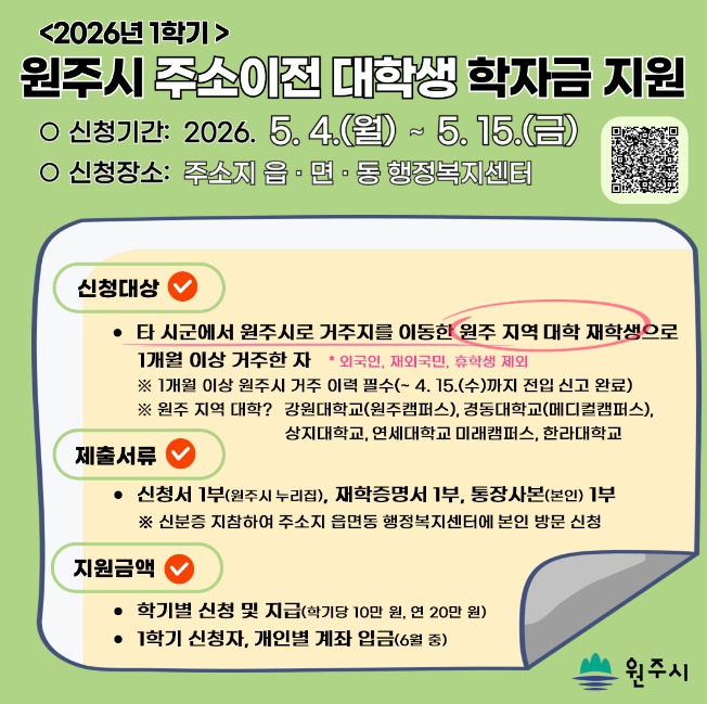 [뉴스앤톡] 원주시는 전입신고를 마치고 원주시민이 된 대학생에게 상·하반기 각 10만 원씩 연간 20만 원의 학자금을 지원한다.