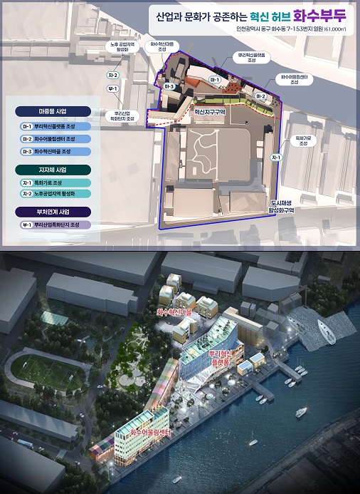이번 사업은 총사업비 1,233.8억 원[마중물사업 1,217억 원(국비 250, 시비 125, 구비 125, 기타 717), 지자체 10.8억 원, 부처 6억 원]이 투입되는 대규모 프로젝트로, 시는 도시재생활성화계획 확정을 통해 2029년까지 화수부두 일원을 산업·상업·주거 기능이 집적된 ‘복합경제거점’으로 조성할 계획이다.