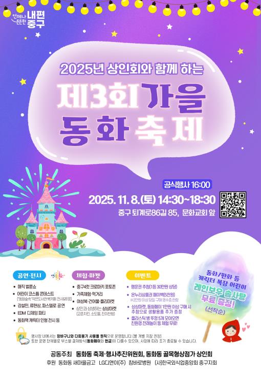 [뉴스앤톡] 서울 중구 동화동 문화교회(퇴계로86길 85) 일대가 오는 11월 8일 오후 2시 30분부터 6시 30분까지 ‘제3회 상인회와 함께하는 가을동화축제’로 들썩인다.