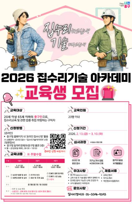 [뉴스앤톡] 서울 중구가 일상 속 불편을 해결하는 집수리 기술을 배우고, 취업과 창업까지 이어질 수 있도록 돕는 '2026 집수리 기술 아카데미'를 운영한다.