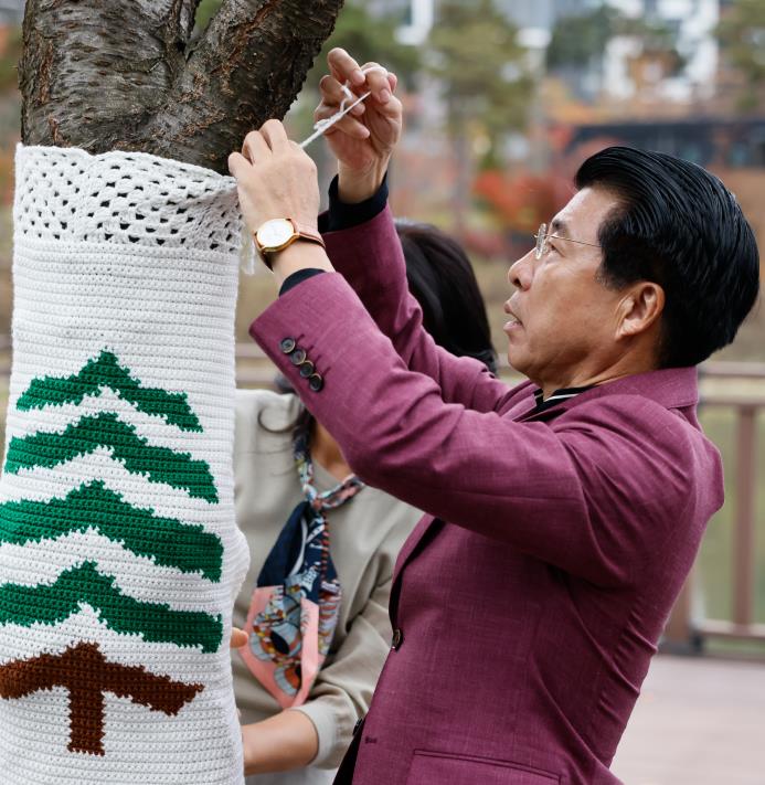 | ▲ 지난해 11월 15일 위례통 트리니팅 개막식에서 나무에 뜨개옷을 입히는 서강석 송파구청장 |