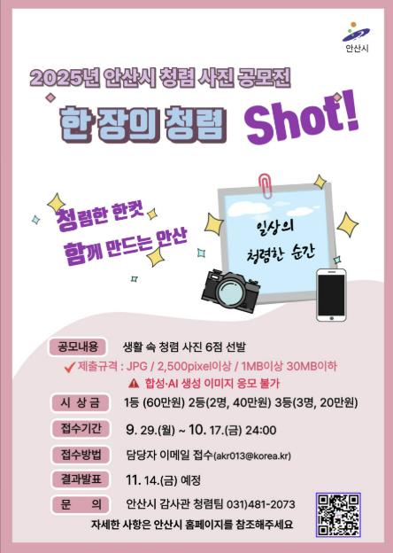 [뉴스앤톡] 안산시는 청렴문화 확산과 시민 공감대 형성을 위해 ‘2025 한 장의 청렴, Shot! 사진 공모전’을 개최한다고 30일 밝혔다.